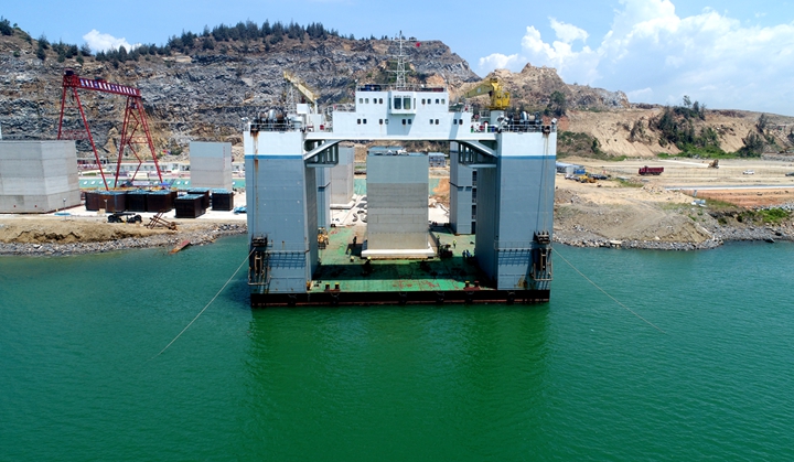 東區(qū)化工碼頭工程新建3個油品化工泊位(2個5萬噸級和1個1萬噸級)及配套設施,碼頭設計年吞吐量為510萬噸。該碼頭工程采用重力式沉箱結(jié)構型式,使用ABCD四種類型沉箱共52件。沉箱高度17m,最大重量為2483.1t。本次出運安裝完成的C型沉箱長12.45m、寬12.45m、高17m,重1122.6t。