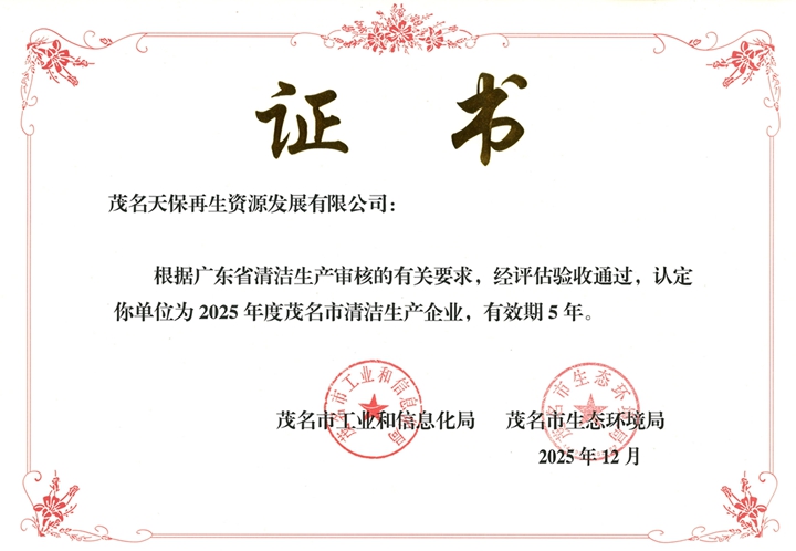 近日,茂名天保再生資源發(fā)展有限公司(以下簡(jiǎn)稱(chēng)“天保公司”)正式確定為茂名市2025年度清潔生產(chǎn)企業(yè),該認(rèn)定有效期為5年。
