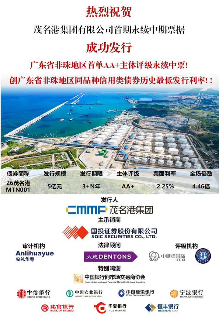 作為粵西地區(qū)首家在銀行間債券市場發(fā)行永續(xù)中期票據(jù)的AA+評級企業(yè),茂名港集團此次成功發(fā)行不僅是在運用創(chuàng)新型權益融資工具、優(yōu)化資本結構進程中的重要里程碑,也為服務區(qū)域重大發(fā)展戰(zhàn)略注入了強勁的金融動能。這一突破標志著集團在拓展多元化融資渠道、提升資本運作能力方面取得了實質(zhì)性進展。本次首發(fā)產(chǎn)品的成功實踐,也為后續(xù)融資工作提供了重要參考與示范。 本次發(fā)行的順利落地,離不開茂名市委、市政府的高度重視與市國資委的有力指導。作為茂名港建設與運營的核心主體,茂名港集團始終緊貼區(qū)域發(fā)展戰(zhàn)略,依托茂名港作為粵西重要深水良港的區(qū)位優(yōu)勢和輻射能力,以及區(qū)域內(nèi)雄厚的石化產(chǎn)業(yè)集群基礎,持續(xù)深耕港口物流、石油化工、資源循環(huán)等核心業(yè)務板塊。在茂名港博賀新港區(qū)重點工程的有力支撐下,茂名港集團已逐步構建起集碼頭運營、倉儲物流、產(chǎn)業(yè)服務于一體的綜合服務體系,不僅為茂名打造沿海經(jīng)濟帶新增長極提供了重要助力,也為企業(yè)自身奠定了堅實的經(jīng)營根基和可持續(xù)的發(fā)展韌性。 此前,茂名港集團已于2026年1月14日成功獲得中國銀行間市場交易商協(xié)會出具的《接受注冊通知書》(中市協(xié)注[2026]MTN26號),獲批注冊發(fā)行總額不超過10億元的永續(xù)中期票據(jù)。下一步,茂名港集團將持續(xù)關注市場動態(tài),在注冊有效期內(nèi)擇機完成剩余額度的發(fā)行。 本次募集資金將嚴格遵循監(jiān)管要求,并結合集團整體戰(zhàn)略規(guī)劃進行精準投放。通過優(yōu)化資金配置,茂名港集團將進一步發(fā)揮國有資本在產(chǎn)業(yè)引領中的杠桿效應,為茂名市“十五五”開局夯實金融基礎、蓄足發(fā)展后勁。(通訊員:張義鵬) |
